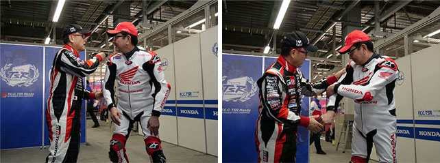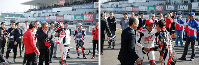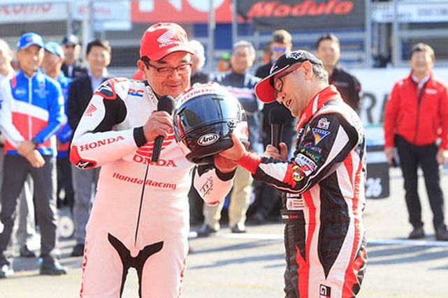 从CBR1000下来的是本田的八乡社长,从雅力士下来的是丰田的丰田社长…他们把头盔递给工作人员,用手接过了麦克风。两人的对话也由此开始。
