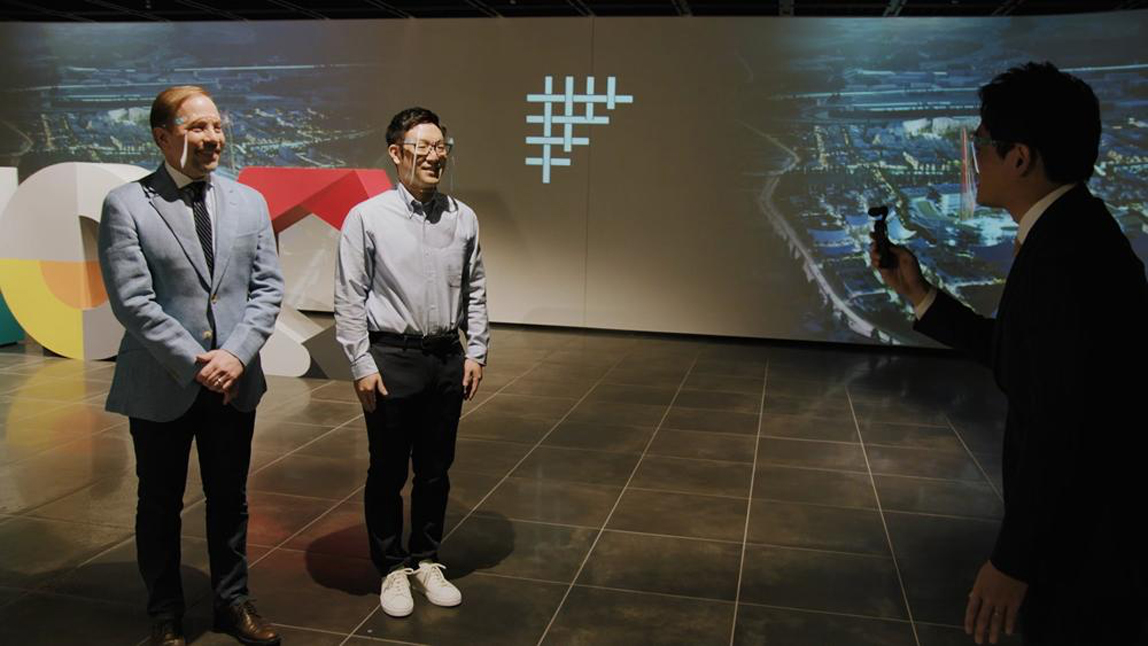通过入口,映入眼帘的便是一整面的视频墙壁。画面中正播放着Woven City的视频。迎接我们的便是Woven Planet Holdings的首席执行官詹姆斯·库夫纳,与同社高级副总裁丰田大辅。