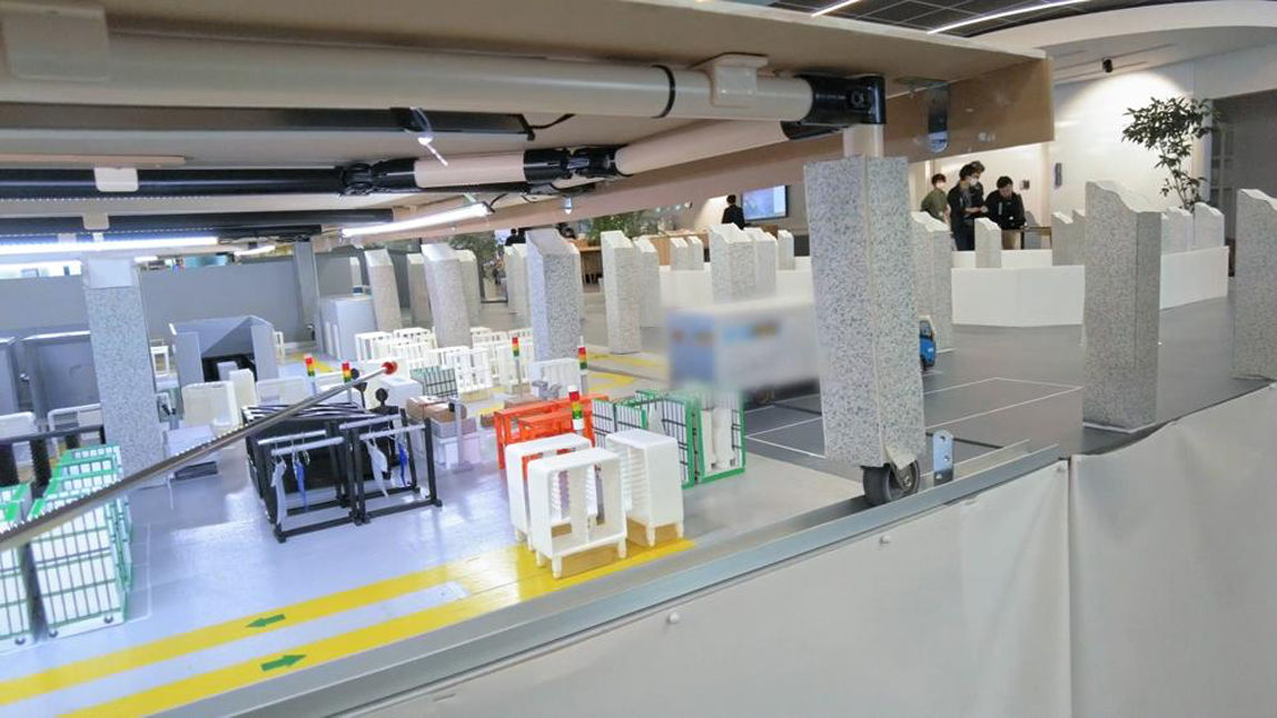 在房间中央放着一个巨大的模型,这个模型就是存在于Woven City地下,预定建设的物流中心1/20大小的等比模型。政田先生通过这个模型为我们详细地解释了物流的运转模式。首先物流的卡车会到达物流中心,工作人员将搬下来的货物码放到S-Palette上。搭载完成的S-Palette自行驶入地下通道,分发到各家各户。