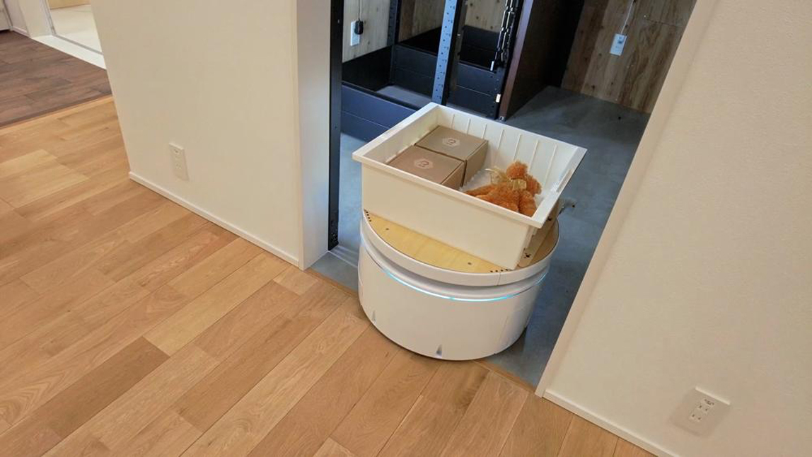 我们来到产品开发的一线,发现这里竟然完美再现了普通家庭的内装。刚一进门“嗡”的一声机器人就迎向了森田记者。这种机器人叫做室内搬运机器人,它能够自己走到位于屋门旁边的智能邮筒中取出货物。当搬运机器人来到邮筒前,邮筒便会自动打开门,并将送来的货物放在机器人身上。乘载了货物的机器人,会将货物自动收纳到架子上。硬件负责人的岩本国大先生说“希望可以运送重物这一点,能够让生活不便的老人们更方便些。”