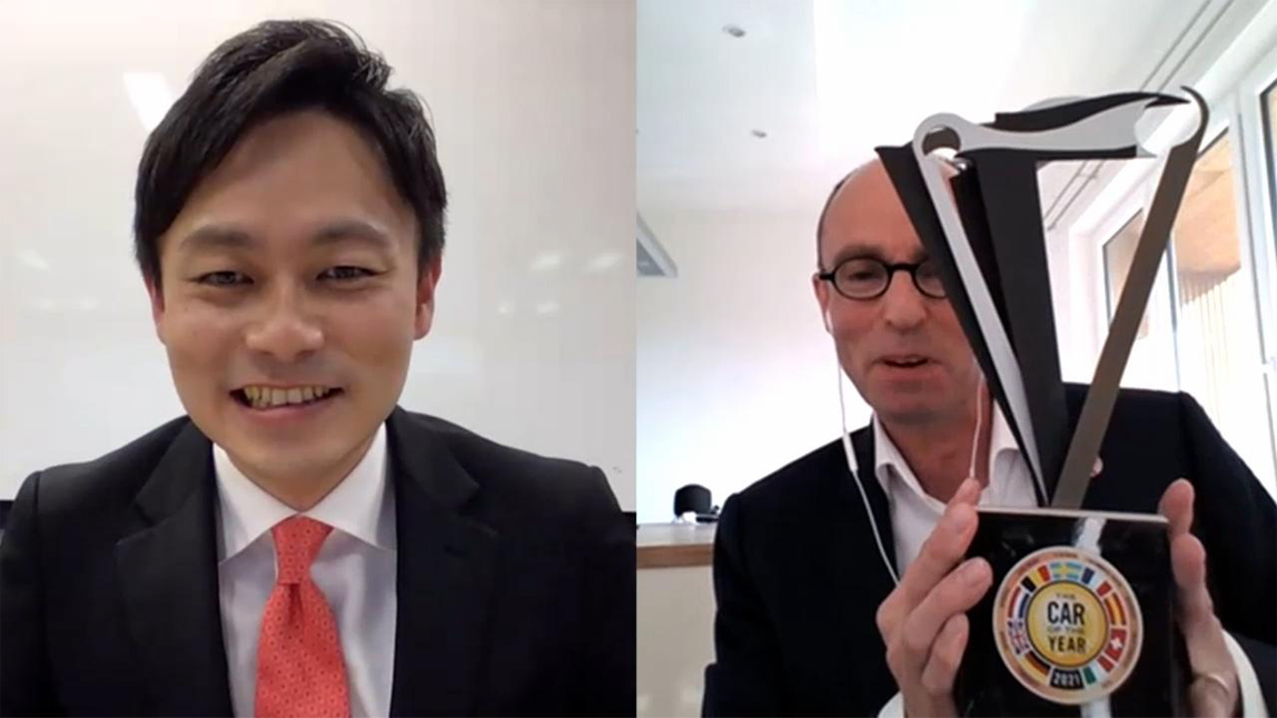 这时,Harrison满脸笑意地拿出了欧洲COTY的奖杯。看他双手捧奖杯的样子就知道,这个奖杯应该是很有分量的。往年欧洲COTY都是在日内瓦车展会场里举办颁奖仪式的,但是2021年受疫情影响车展停办,颁奖仪式只能线上召开。所以Harrison是在位于比利时布鲁塞尔的TME本部参加的颁奖典礼,当然也未能第一时间拿到奖杯。可正巧现在奖杯刚刚送来,Harrison说:“稍后我会转寄给丰田社长,现在正好在我手上,就拿出来给你看看。”