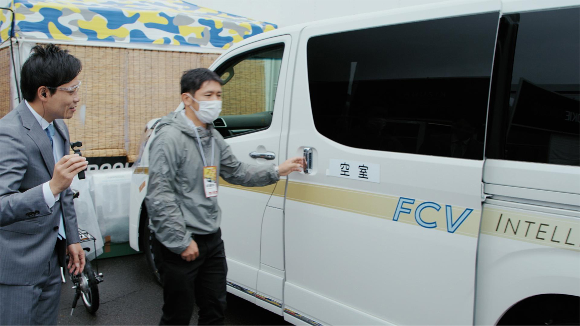 在这辆车旁边停着的另一辆FCEV是厨房车。车上面配有冰箱以及IH灶台,还可以用电饭锅做饭。