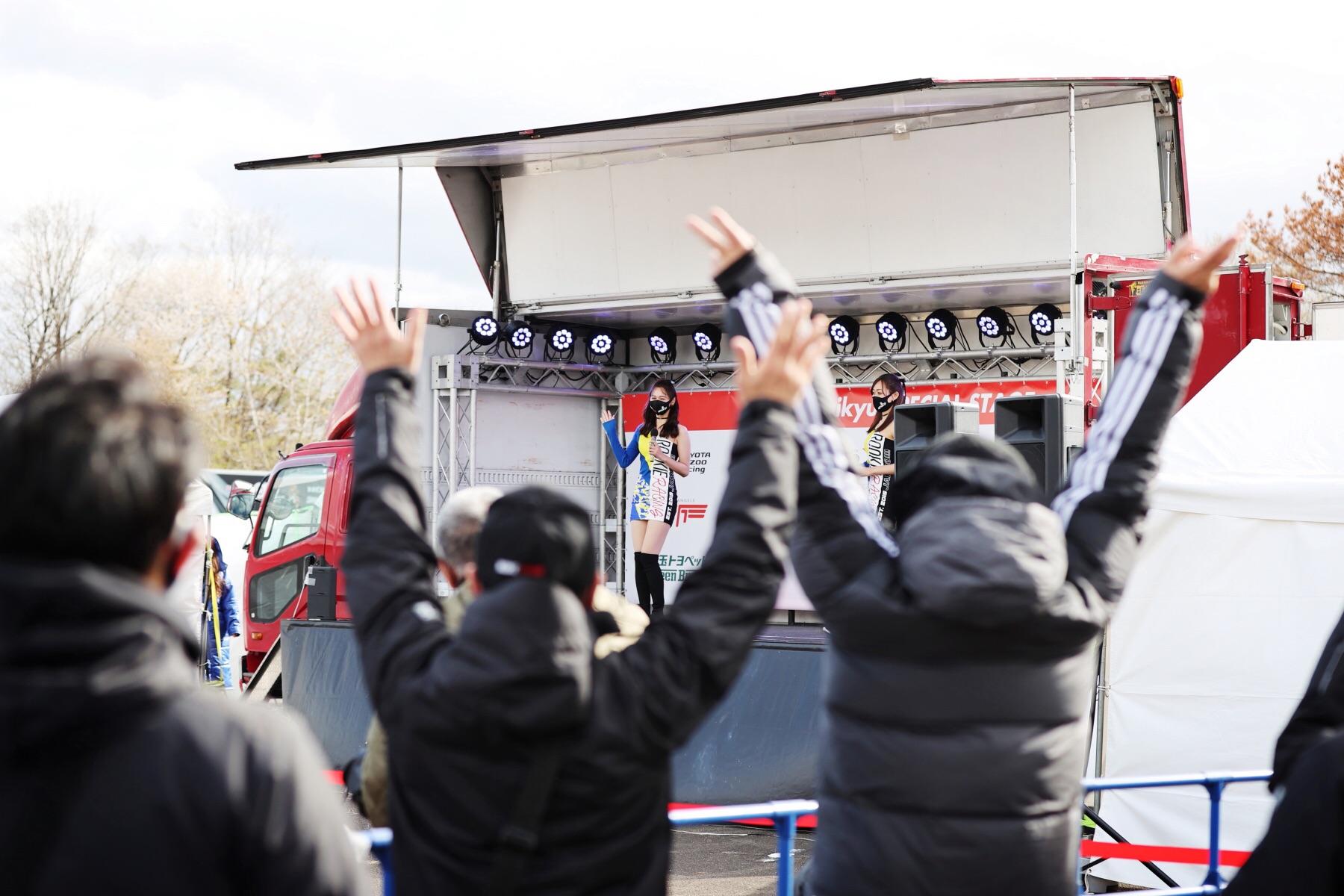 下午3点25分,被粉丝围住的表演会场区内,赛车女郎们的车队宣传表演开始了。这是ROOKIE Racing两位赛车女郎的首次登台演出。此时台下的Morizo也高举双手,又蹦又跳的,与粉丝们融为一体,享受着表演。