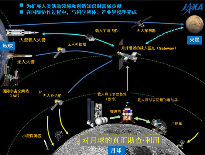 用载人·无人火箭从地球发射上去的宇航员和物资,经由Gateway后降落到月球表面。宇航员只是在需要的时候才降落到月球车的附近,所以月球车的长距离移动是靠自身的AI进行自动驾驶的。(据JAXA资料)