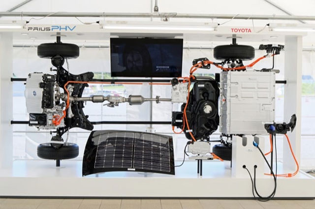 [照片]THS(丰田混合动力系统)的全貌。照片为PHV款,电池稍大,但是基本系统是与HV相同的。具备太阳能发电功能的顶部是仅限于PHV的选配件