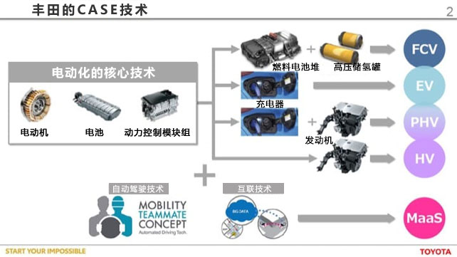 丰田在2015年1月宣布免费提供燃料电池车(FCV)的专利,2017年9月通过与马自达、电装设立的EV C.A. Spirit,宣布制定并公开EV(电动汽车)的标准规格。