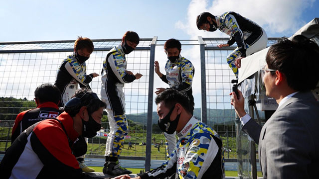 车手Morizo,即丰田章男社长,手持扩音器,对完成24小时耐力赛的车队成员们给予了鼓励。