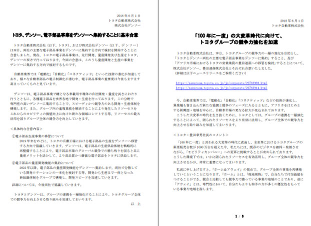 例如,在当前的形势下,比起让丰田、电装的每家公司各自为政,更应当将丰田的电子零件业务整合到擅长电子零件业务的电装,以提高生产率,增强综合竞争力。
