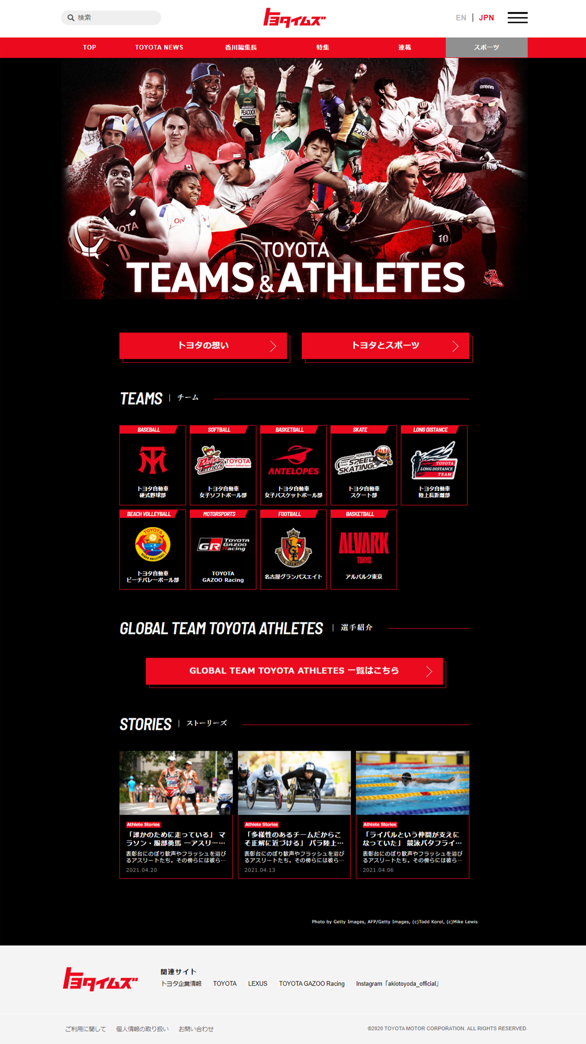 另外,在“TEAMS & ATHLETES”栏目中,我们将为大家介绍约240名运动员。他们是来自硬式棒球部与女子篮球等体育社团、Nagoya Grampus Eight和Alvark Tokyo等职业球队,以及活跃在世界各地的国际团队中的丰田运动员们,当然我们也可以通过锁定某项比赛或地区来寻找相关的运动员们。另外,我们还将采访那些专心朝着更高目标不断发起挑战的运动员们,并在此刊载他们的故事。