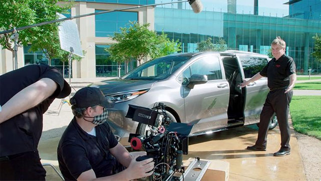 新款SIENNA的拍摄地点位于TMNA总部,演讲者是主管销售的董事鲍勃·卡特。由于所有员工都在居家办公,因此拍摄是在园区内空无一人的情况下完成的。另一个拍摄地点是丰田品牌主管杰克·霍利斯(Jack Hollis)的家。他们把新车放在车库的前面,并揭开了新款Venza的面纱。