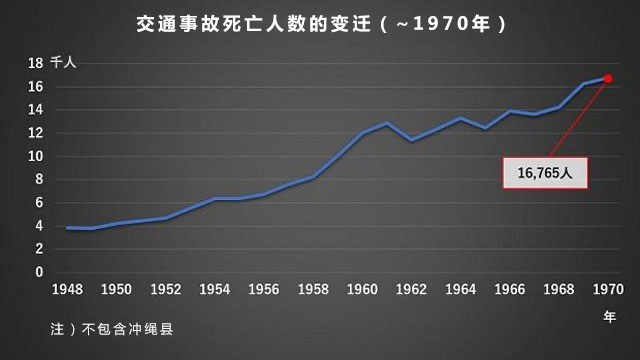 但在其背后,交通事故不断上升已成为社会问题。交通事故死亡人数在1959年突破万人之后一路上升,1970年则达到了16,765人,创下了历史记录。这种危机状态被称为“交通战争”。