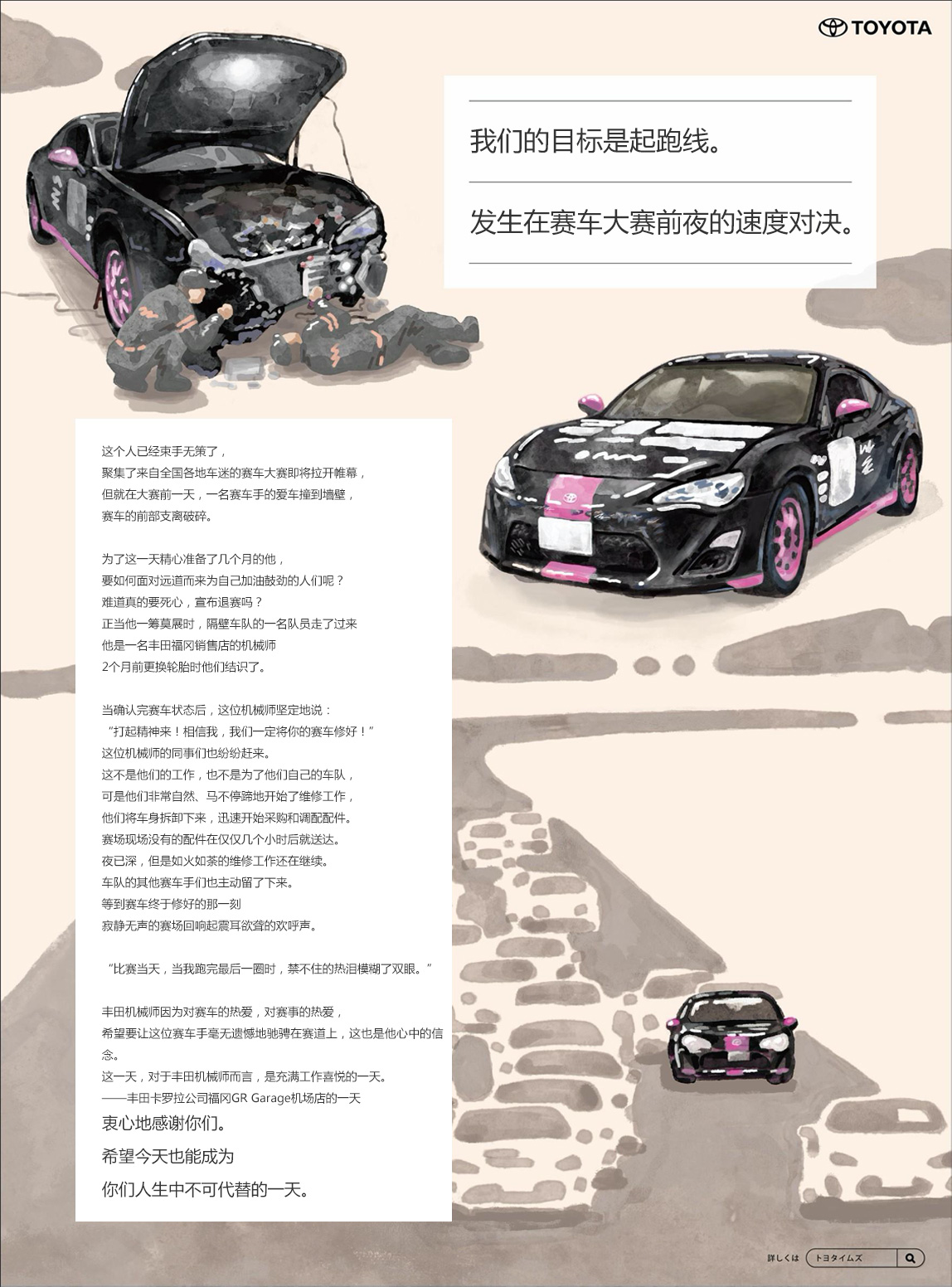 在此次赛车比赛前夜的救世主篇中,我们将给大家讲述一段在赛车场发生的丰田销售店店员和一名业余车手的故事。在这个只有短短几个小时的故事中,为了让车手毫无遗憾地体验赛车的乐趣,丰田机械师们燃起了熊熊斗志。