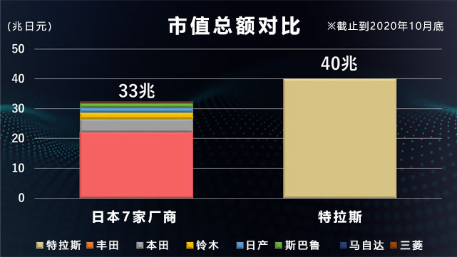 相比之下,7家日本汽车制造商的市值总额约33兆日元,从这个角度确实可以说特斯拉一家创造的企业价值超过了所有日本厂商之和。