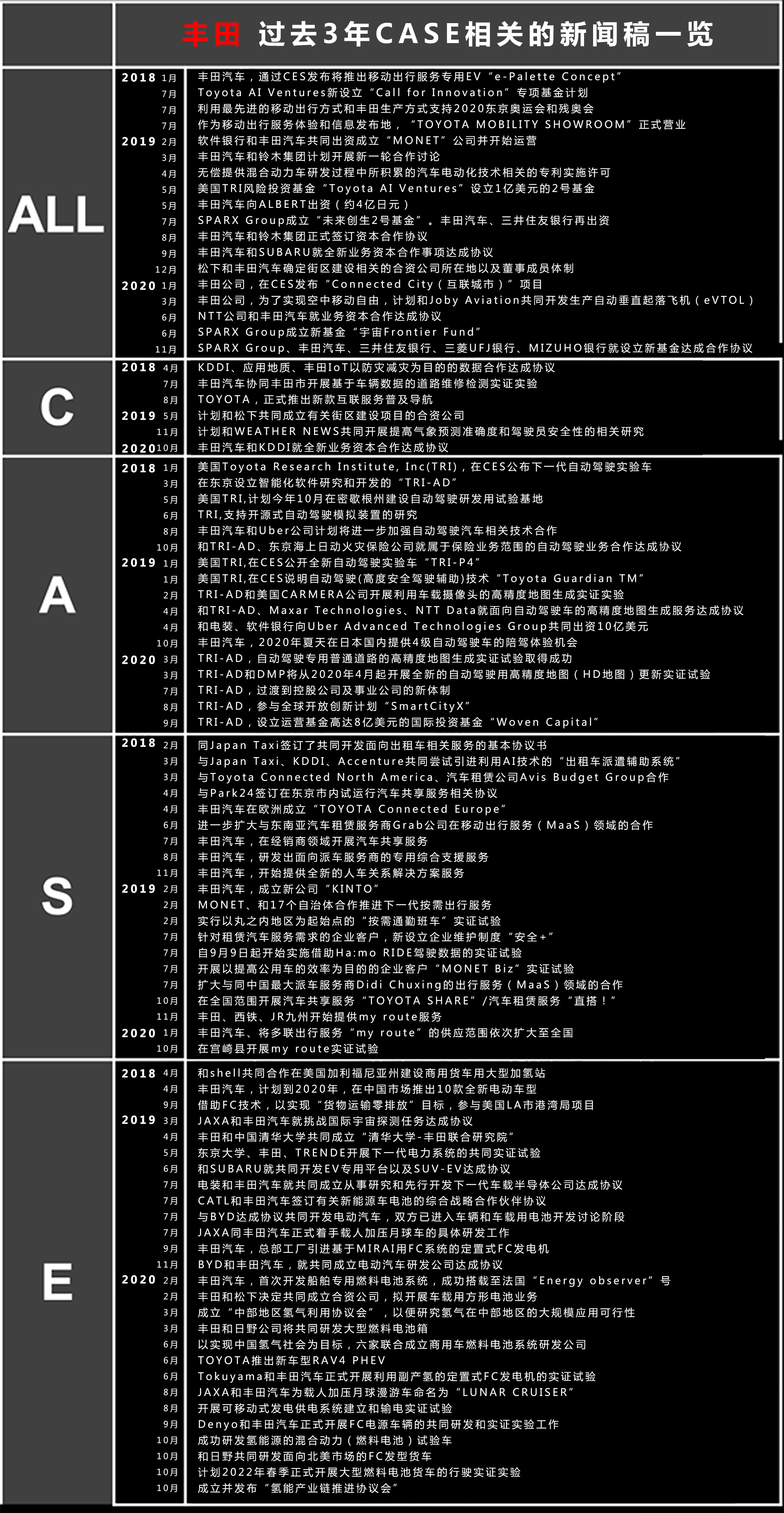 丰田关于CASE应对措施的新闻稿标题一览(过去3年份)
