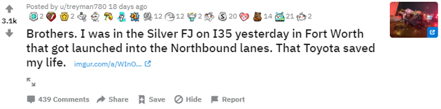 昨天,正当我驾驶着FJ CRUISER行驶在沃思堡地区的35号公路上时,被卷入了一场惨烈的交通事故,但丰田汽车救了我一命。