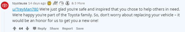 几天后,丰田汽车北美公司在社交媒体上给与了回复。