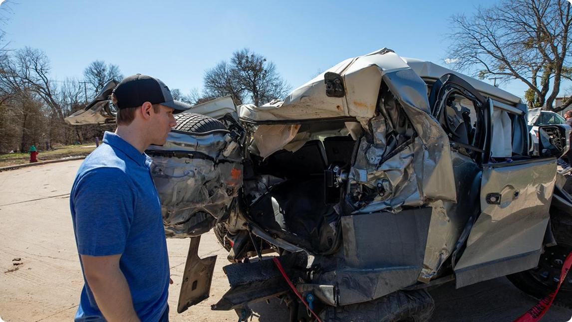全身遭受磕碰撞击的麦克丹尼尔,费尽全力从驾驶室的窗户中爬出来,映入眼帘的是前后都被撞击得溃不成型的汽车。
