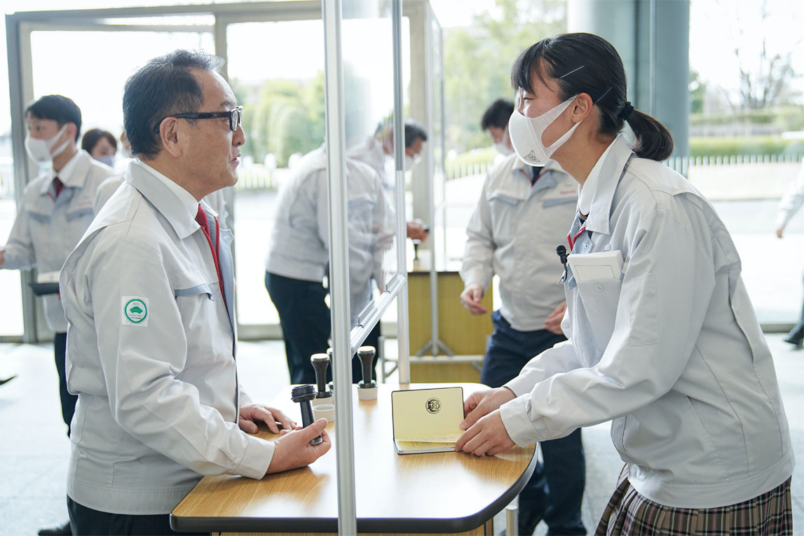 丰田社长与各位学生亲切交谈,并在学生的员工手册上按下Morizo的专属印章。作为毕业生代表发言的今福同学也一扫刚刚的紧张心情,露出笑容。