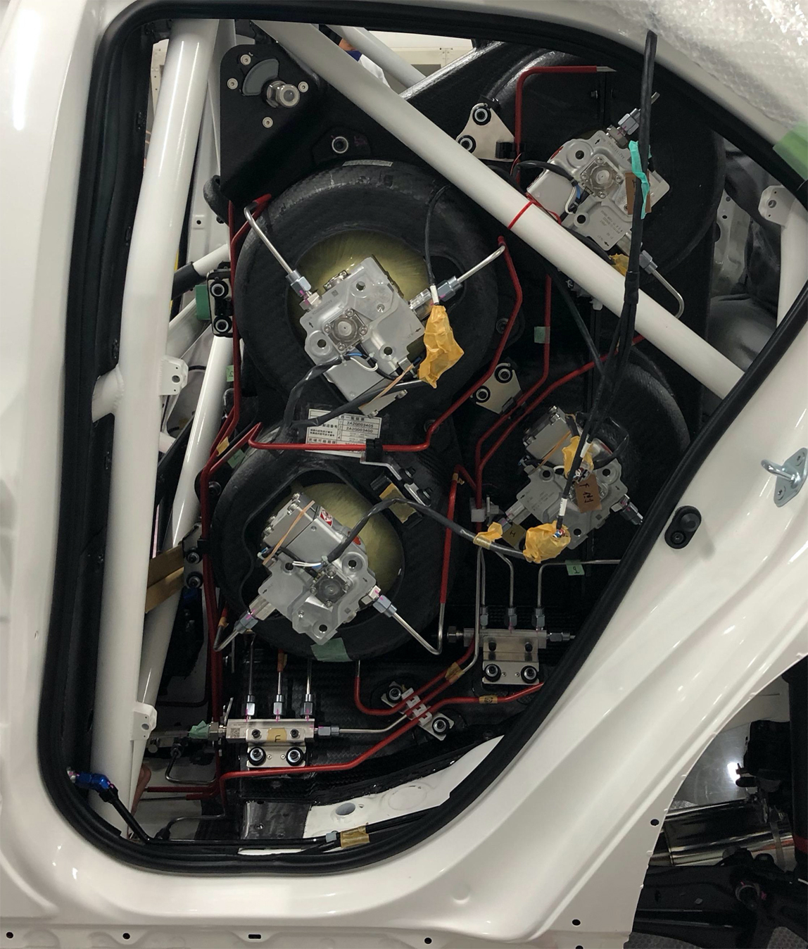 MIRAI搭载了大、中、小共计3个尺寸不同的储氢罐,而此次参赛车辆搭载了4个储氢罐。其中2个储氢罐直接使用MIRAI搭载的中号,另外2个选用将中号储氢罐改良成稍短些的型号。容量方面,MIRAI为141升,此次参赛车则为180升。为了一次加氢能行驶更长的距离,在车里放入了尽可能多的储氢罐。