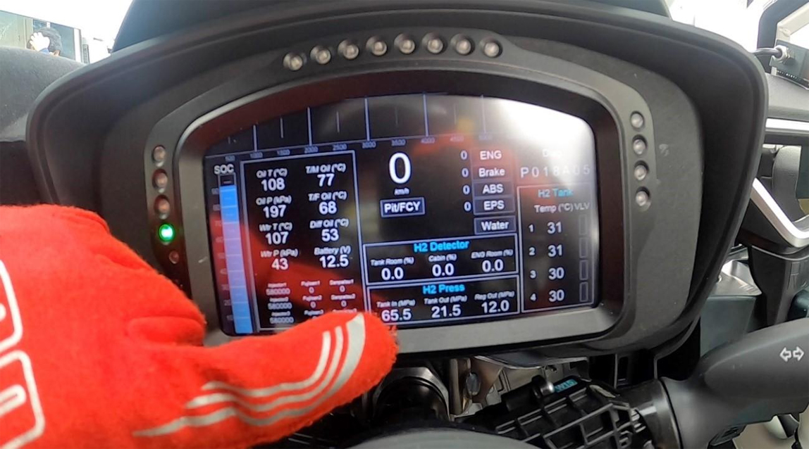 设置在车手前面的显示仪表上可以看到储氢罐内部氢气压力指数。 如果该数值降低,则意味“氢能不足”。