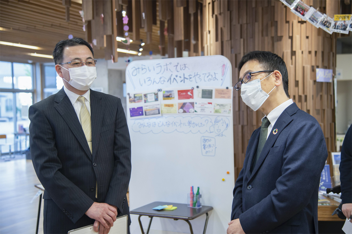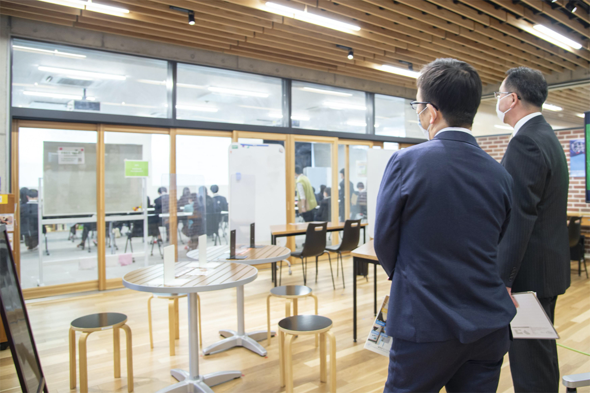 从找到问题到落实解决方案,学生自主行动,积累与当地民众沟通的经验。在这个双叶未来实验室里,学生们各种活动的内容贴满了整面墙。对此,桑田CHRO露出了惊讶的表情,感叹道:“这样的学校只此一家吧”。柳沼校长表示:“我们的目标是社区重建,让大家的气氛都能高涨起来”。