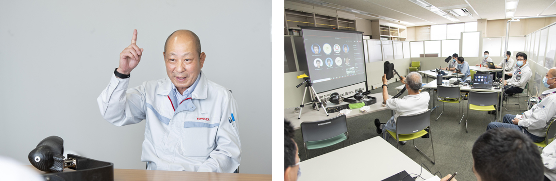 随“伸出你的手指!”口号聚集在一起的丰田汽车技术人员和熟练工。现在还能每月召开两次视频会议。
