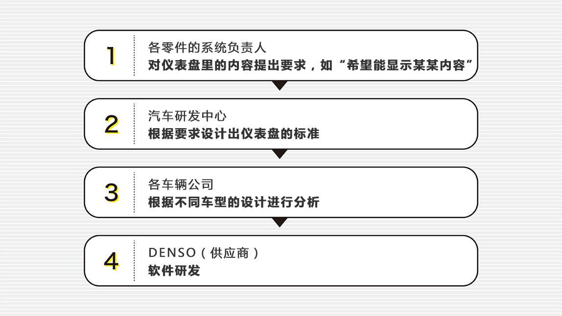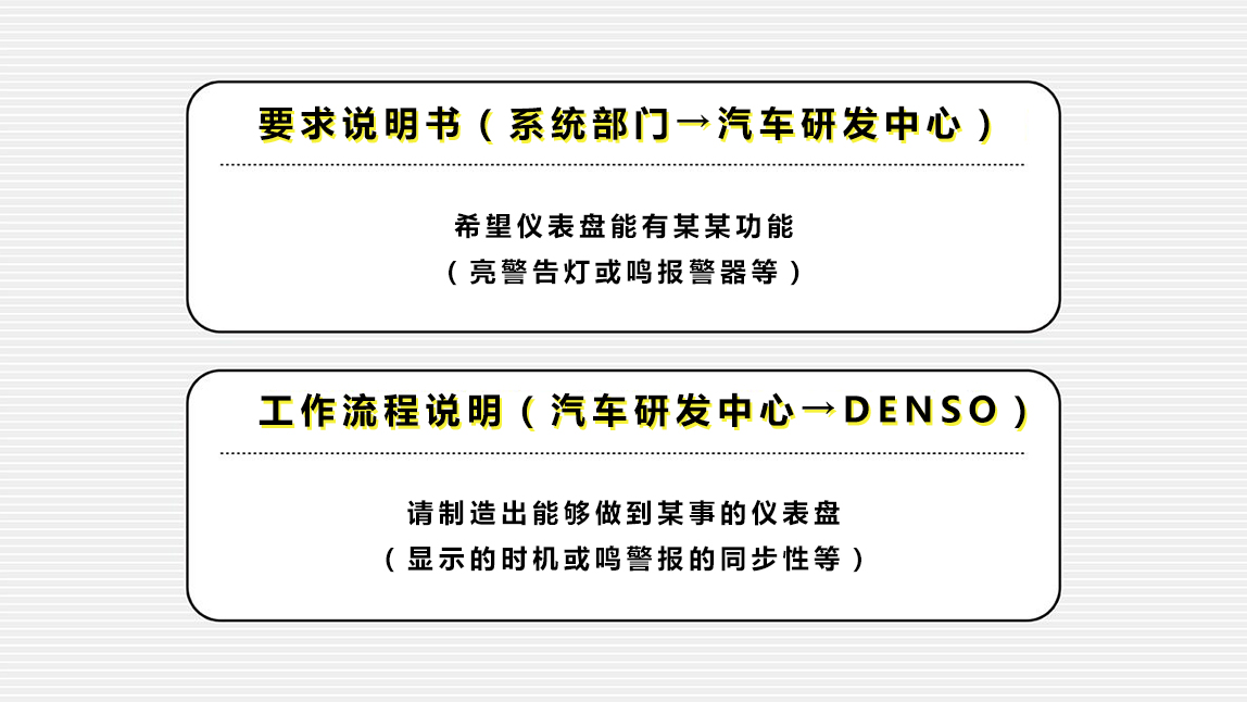 总结一下,大致流程是:汽车研发中心从前一道流程那里接收“希望仪表盘能显示某某内容”的委托(要求说明书),并进行整理汇总,然后将记录“仪表盘该如何工作”等详细内容的工作流程说明书,发给负责后续流程的DENSO,让他们制作仪表盘。