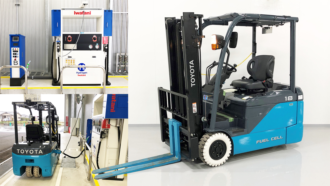 “这种车与普通的发动机式叉车不同,完全不会排放CO2。今后中心还打算追加投入27辆左右。作为燃料的压缩氢,可以通过工厂内的自助加氢机填充,加氢形式与普通的加油站类似。”