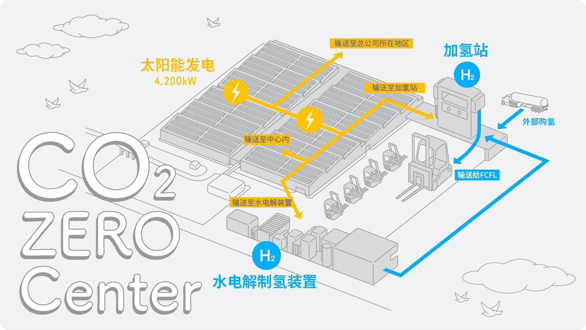 “中心内的照明等用电,全部都是来自于太阳能发电。此外,通过电解水生成的氢能,是中心内叉车的主要燃料来源。”