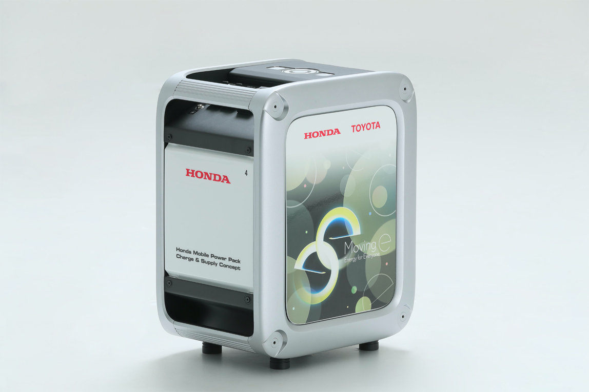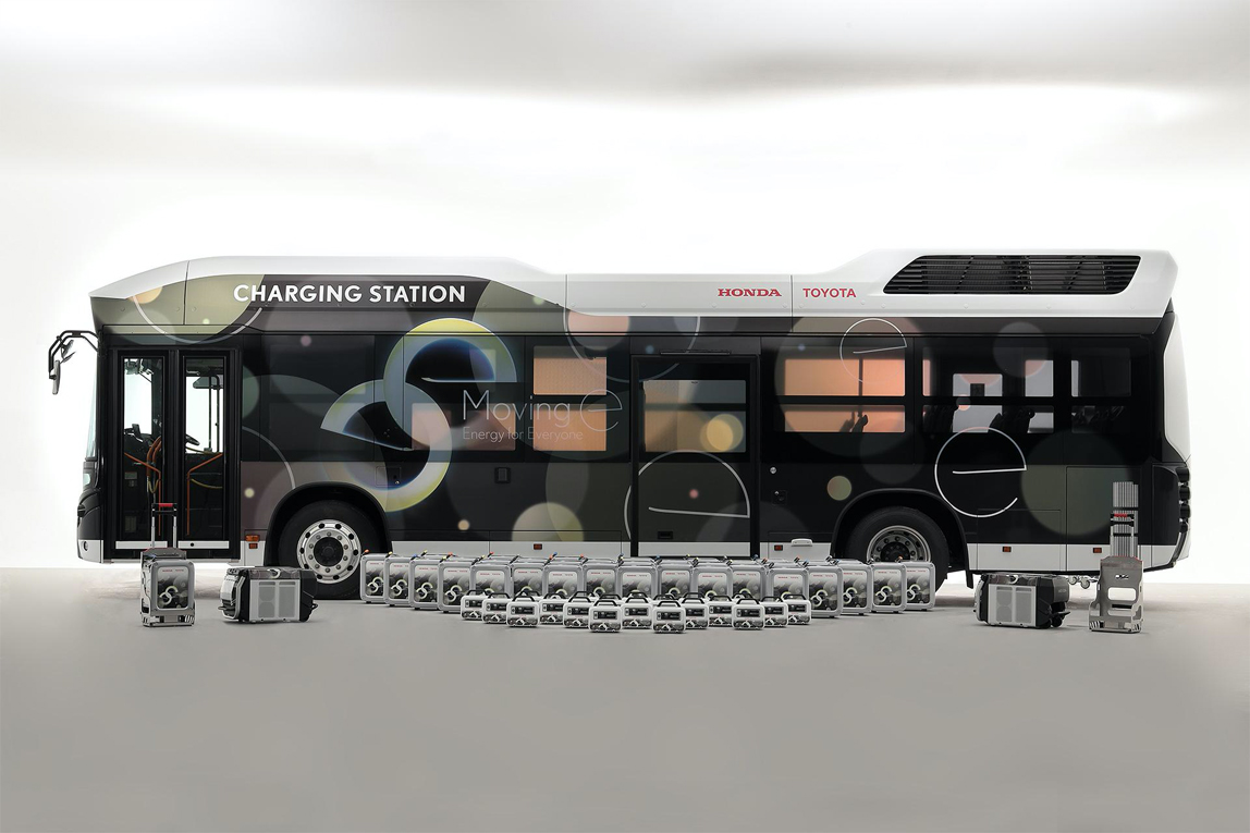 “Moving e”由丰田的燃料电池巴士“CHARGING STATION”、本田的便携式外部供电器“Power Exporter 9000”、便携式电池“LiB-AID E500”、“移动电源组”、移动电源组的充电供电器“Honda