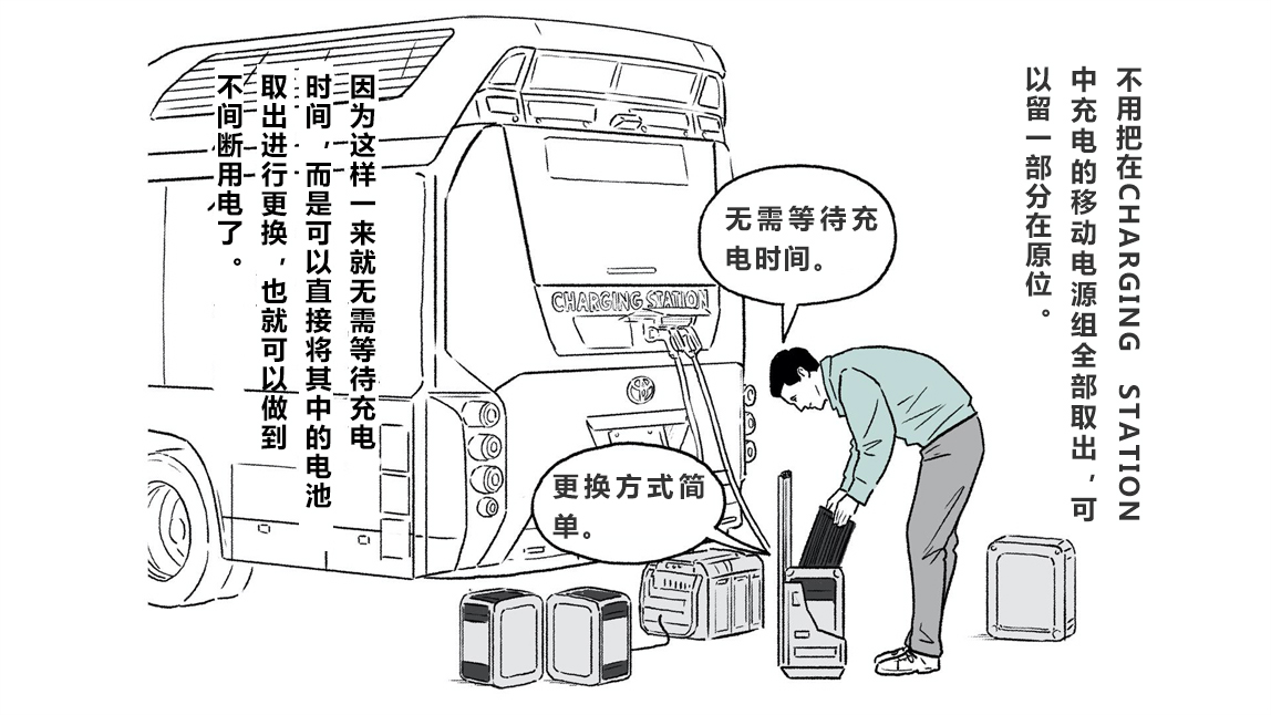 这一天他们的午餐是用电水壶烧开的水泡的杯面、用微波炉加热后的冷冻烤饭团。此时移动电源组里的电力会很快被消耗殆尽,随后没电的移动电源组会被带到巴士上充电,同时他们将已经充电完毕的另一个电源组拿出来使用。因为比起再次花时间充电,更换其中的电源组又省时又高效。而没电的移动电源组还可以继续充电。按照这个循环流程走,就能实现高效用电。