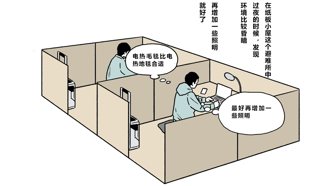 令人意外的是这次最受欢迎的是小功率电热毛毯,这款产品最近在爱好车中过夜的人士中也颇有人气。因为比起电热地毯,电热毛毯不怎么费电,所以就算整晚使用,电量也绰绰有余。也多亏电热毛毯,实验人员们平安度过了京都12月的寒冷夜晚。另外,入夜后他们才意识到,要是有更多的照明就好了。由于这次实验模拟的是因灾害而停电的避难所,所以他们带了3台气球灯之类的照明设备,各自的纸板小屋里也都有LED灯,但如果各纸板房间里都能有照明的话会更让人有安心感。他们也亲身体验到了电力的宝贵之处。