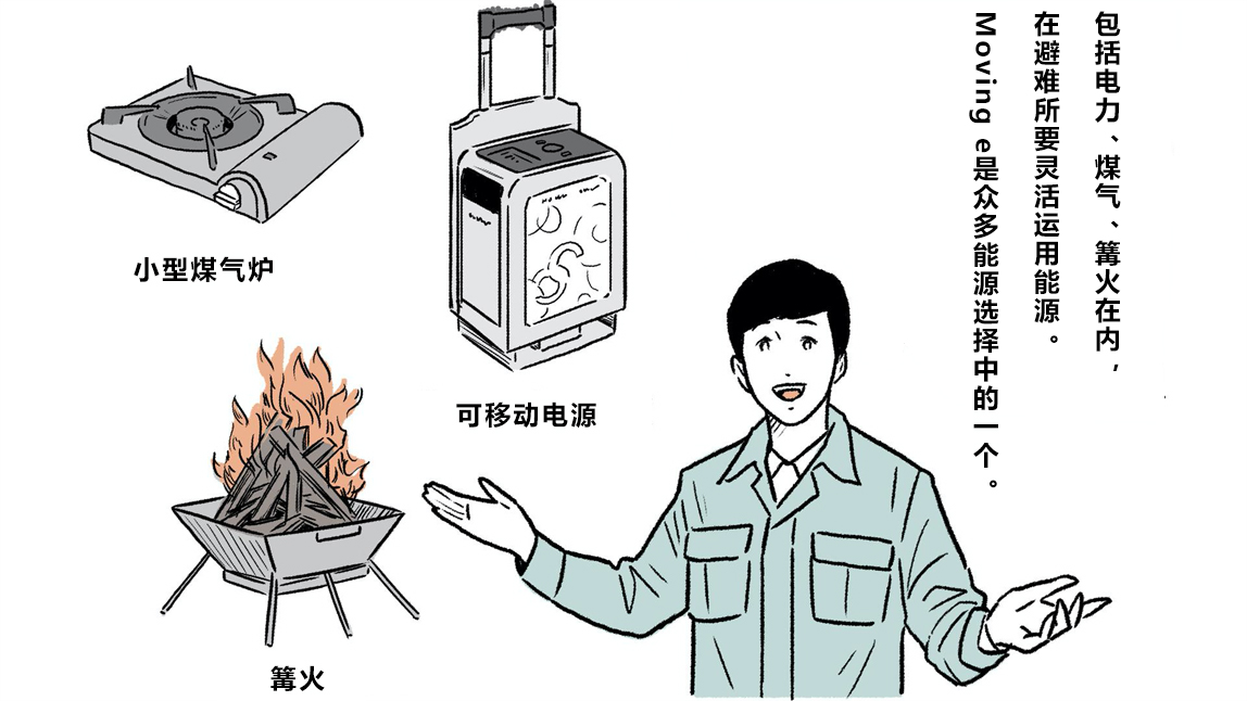 实验结束了。如果以本次实验结果为基础计算详细的用电量,那么包括往返100公里外的避难所在内,“Moving e”大约可以让50个人度过3天时间。根据调查显示,一般的避难所大多是30人以下居住的,考虑到这一点,足以证明用一套“Moving e”设备就能让避难所的生活变得舒适一些。