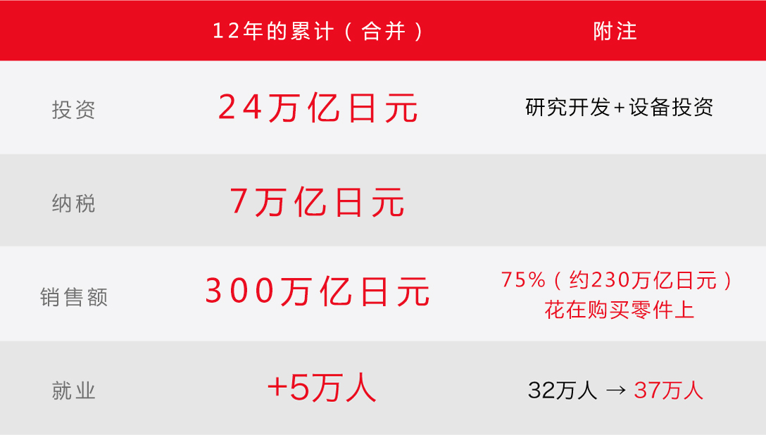 假设家庭年收入为500万日元,那么丰田带来了5万人乘以500万日元——共计2500亿日元的家庭开支费用。
