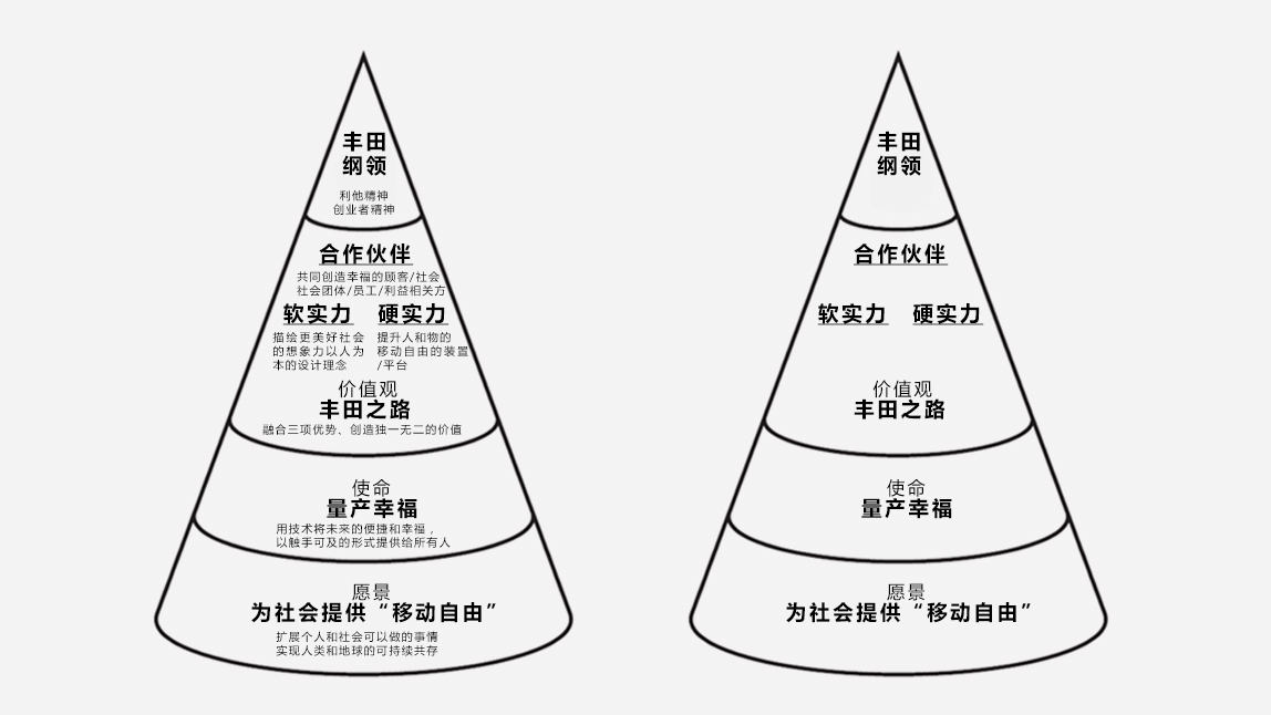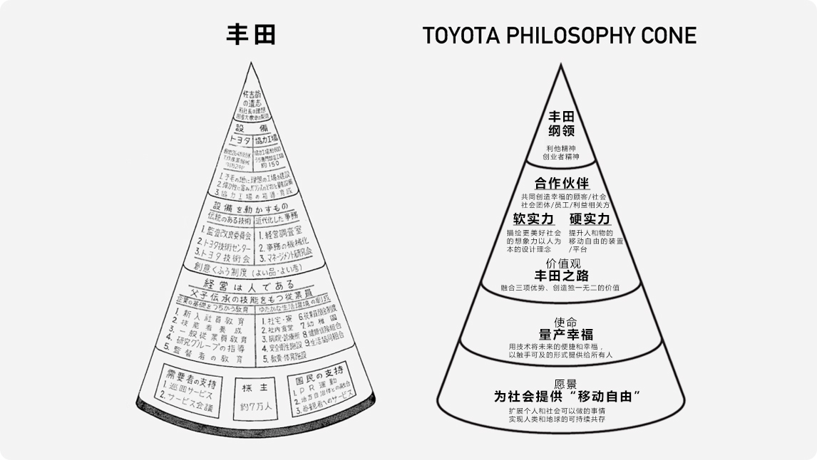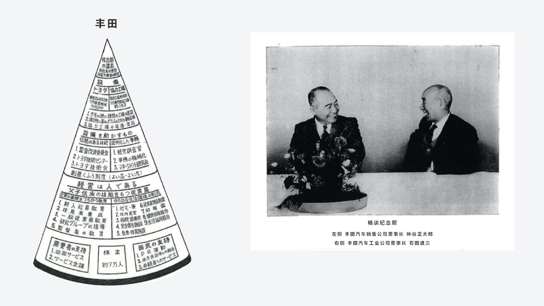 上图左侧为60多年前,在创始人丰田喜一郎去世后,继承其遗愿的经营团队制作出的锥型图。