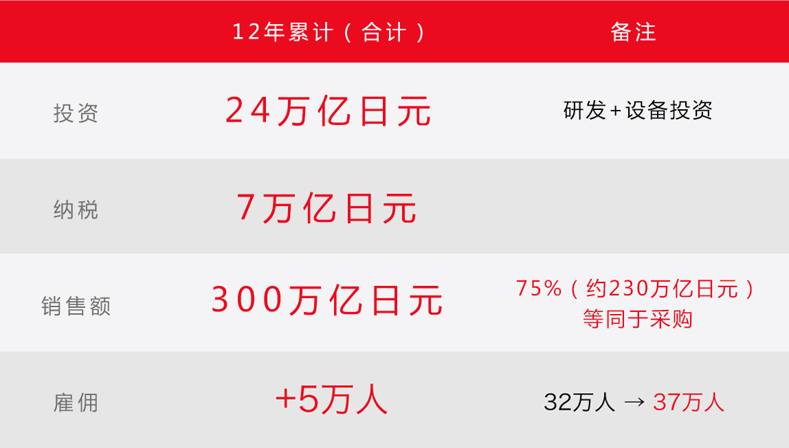 日本国家年度预算大概在100万亿日元左右,通过对比我们不难发现,丰田这12年为社会做出的奉献不容小觑。销售额达到300万亿日元,向供应商支付金额为230万亿日元。增加员工5万人(包括派遣与临时工等),创造了2500万亿日元的家庭收入。股价总额上升了相当于消费税10%的20万亿日元。