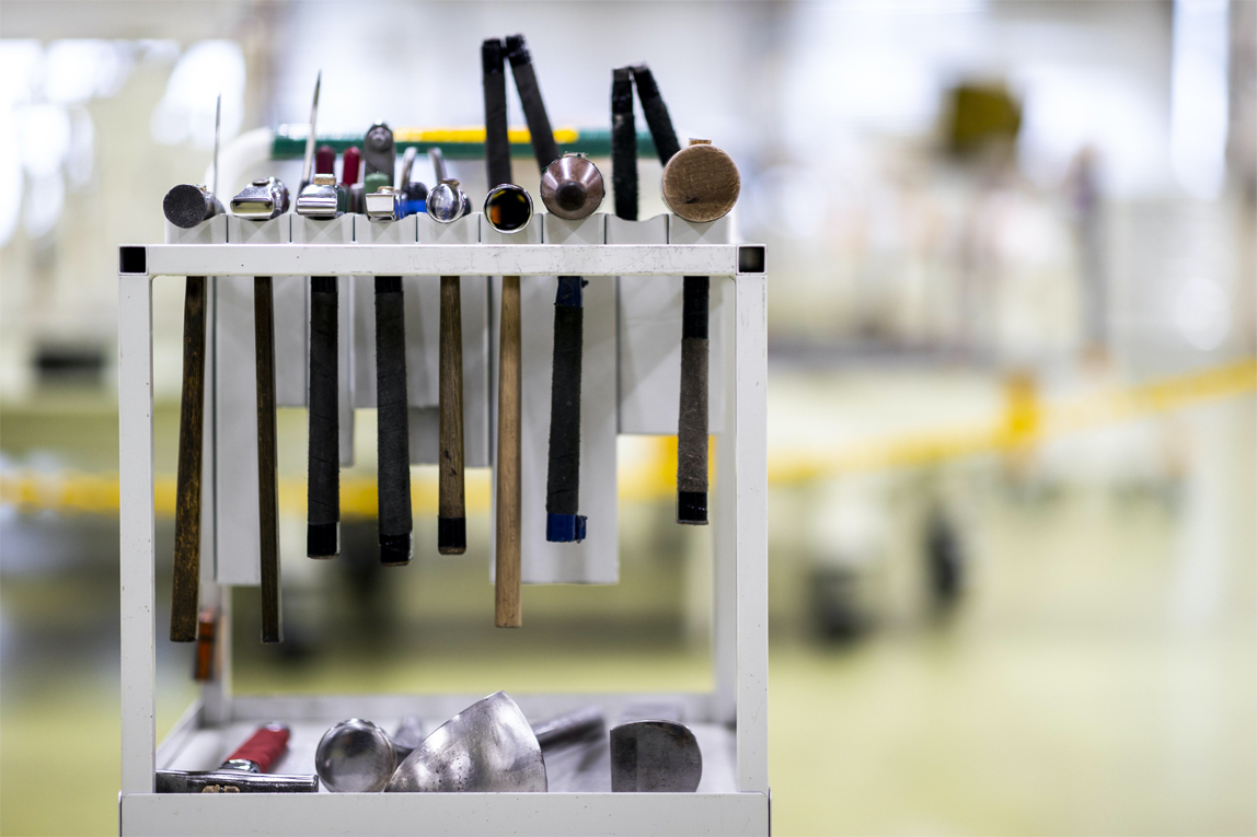在这个部门工作的钣金匠人们都拥有自己的工具。工具必须是用与其敲击的物品相匹配的材料制成的,因此可以说材料的选用也是钣金匠人的know-how之一。特别是木锤的选材,据说每个匠人都有自己的考究。吉野的话,除了木材以外,还使用了一种叫苯树脂的树脂材料。这是他从获得了世界技能大赛冠军的“钣金师傅”那里得来的经验。