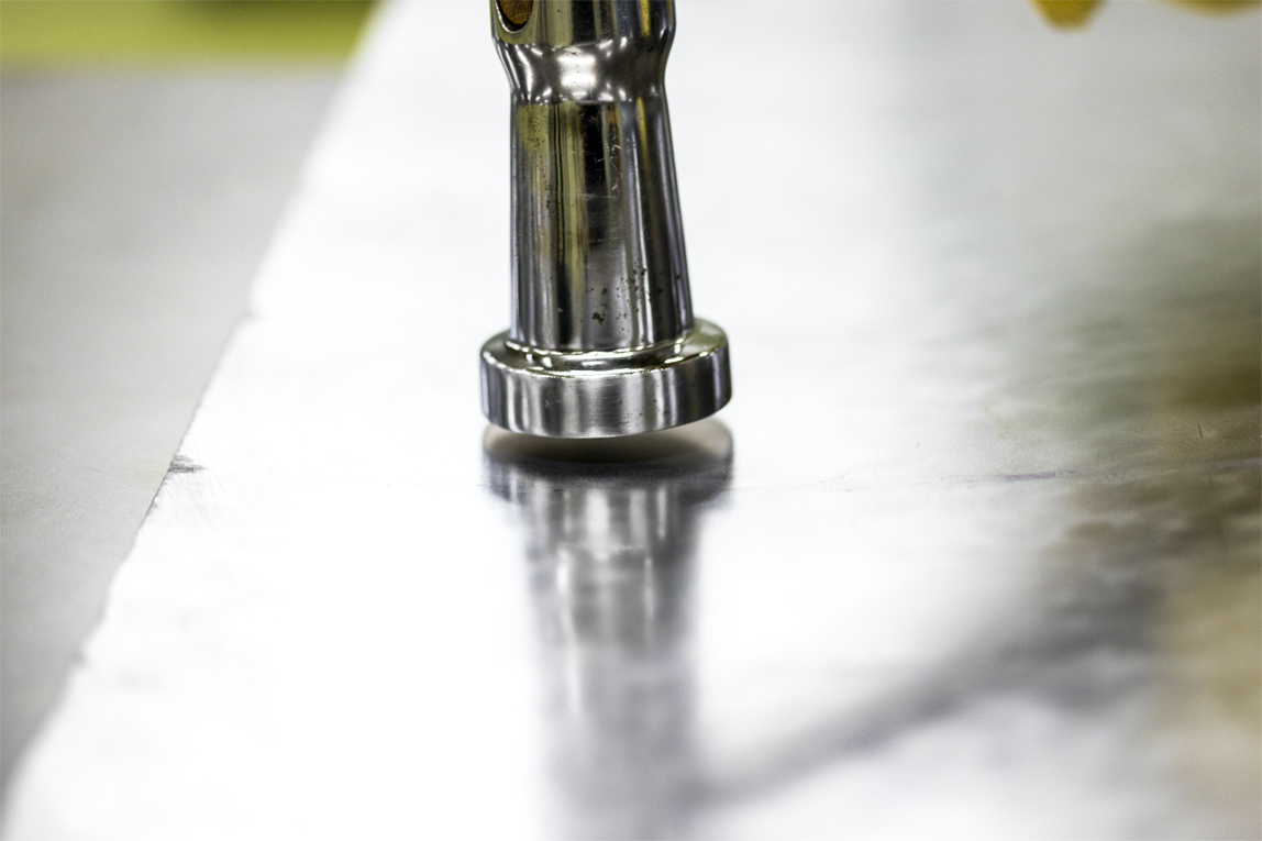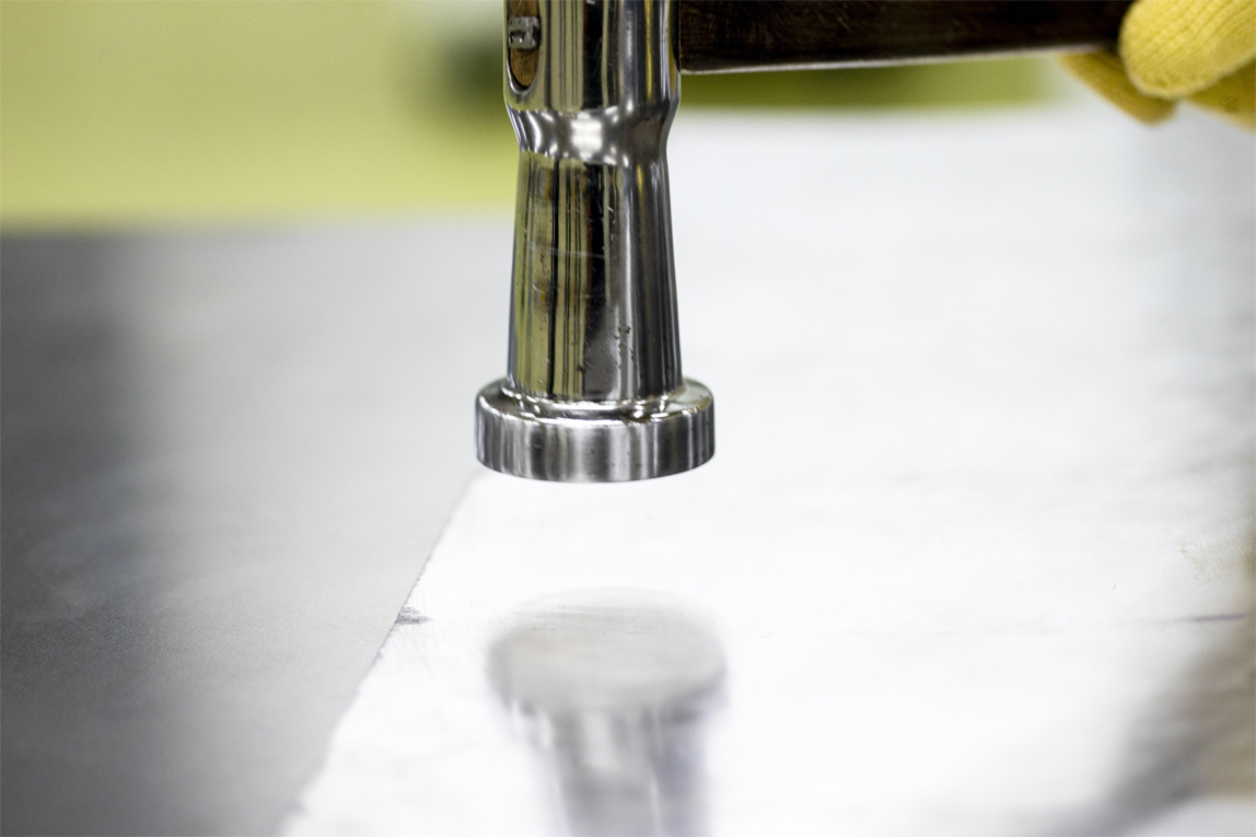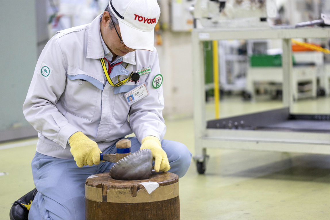 那么吉野作为“钣金匠人”的看家本领是什么呢?在造物研发中心的一线,他用锤子为我们演示了自己是如何进行手工作业的。