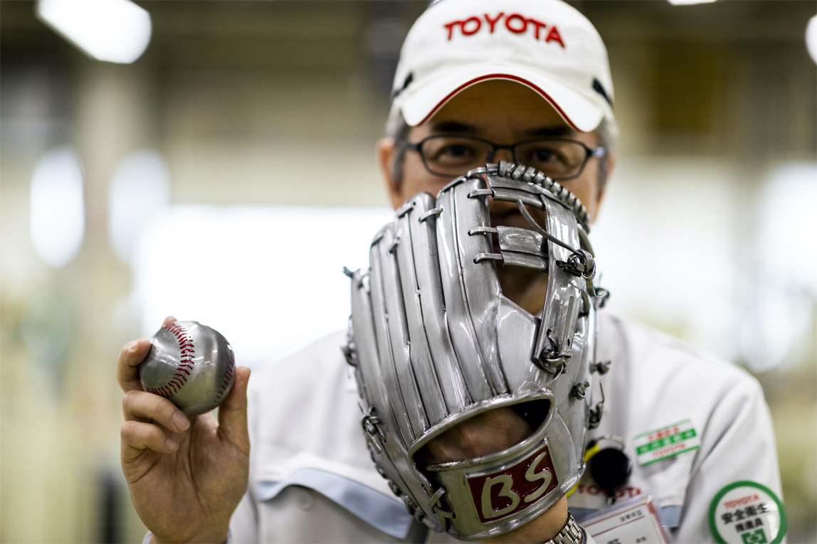这是过去前辈们用钢板做的棒球手套以及棒球,连铃木一郎选手将其拿在手里也感到大吃一惊。这做工与皮革制的手套竟然同样细腻,让人惊叹不已。虽然是铁制的,但是表现出来的效果让人完全看不出这竟然是铁做的。