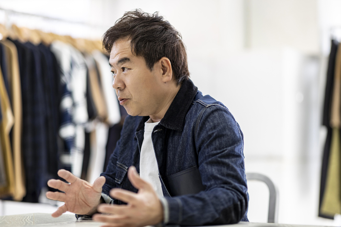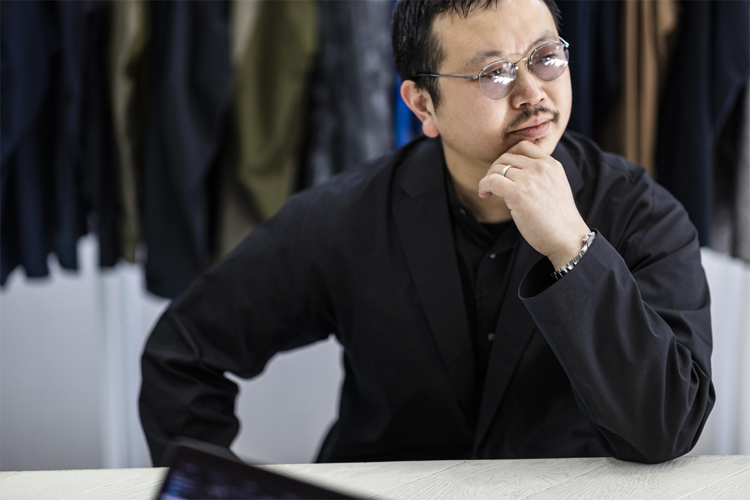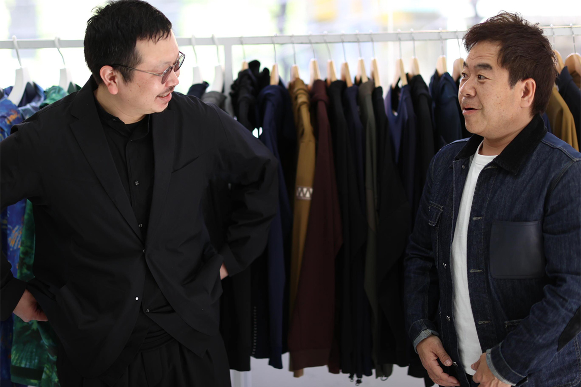 汽车新闻记者冈崎五朗(右)、设计师相泽阳介(左)。于摆放着下季样品的White Mountaineering办公室内。