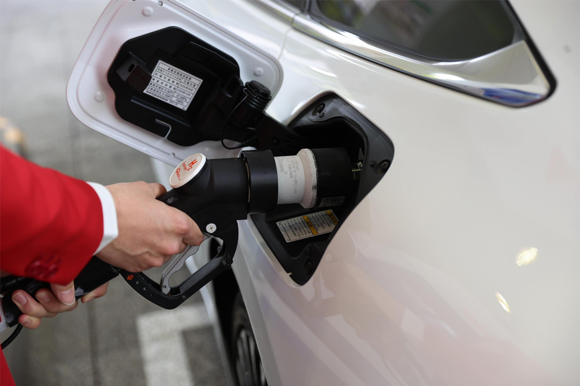 专业工作人员在加氢站实施加氢作业。加氢时间只要3分钟左右。目前,日本全国已设置147处加氢站(截至2021年7月)。