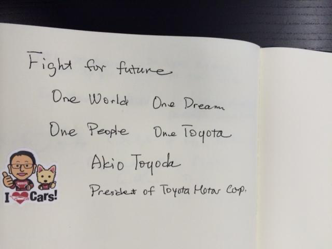 “One World, One Dream”原本是2008年北京奥运会提出的主题口号,在北京奥运会闭幕式时,我在原来的口号中加上了“One People”。当我向章男社长说明时,他立刻加上了“One TOYOTA”并写在一张纸上。