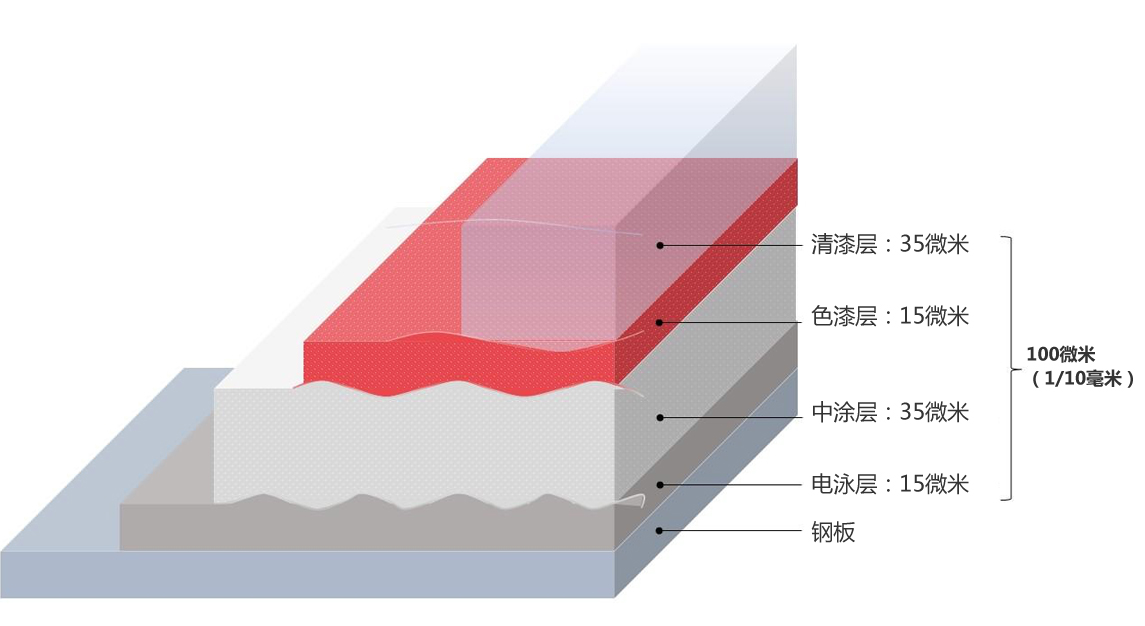车漆的厚度只有1/10毫米(100微米)左右。但是这薄薄一层汽车“皮肤”却是由四层涂面构成,也就是要经历4道涂装工序。