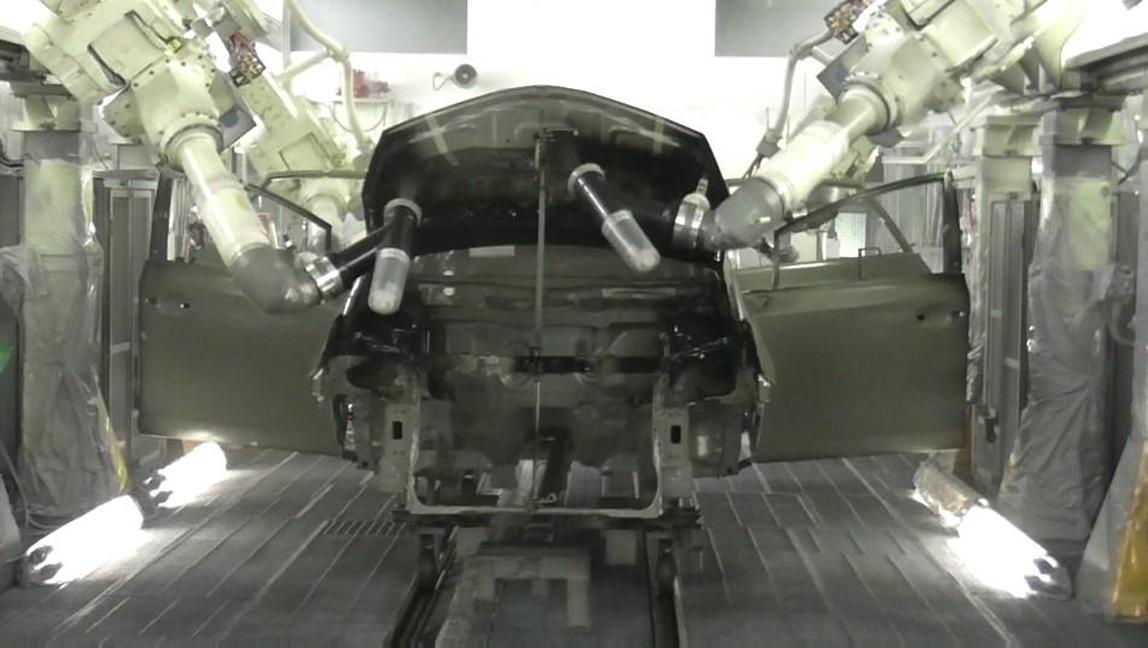 在豪华轿车中,只有很少一小部分的涂装是通过空气喷绘完成的。最新的涂装工程中,会在丰田自主研发的“无空气车漆喷雾器”上配置最新型的机器人。机器人灵巧地挥动机械手臂上,高速精准地在一台台随传送带移动的车体上喷绘涂层。