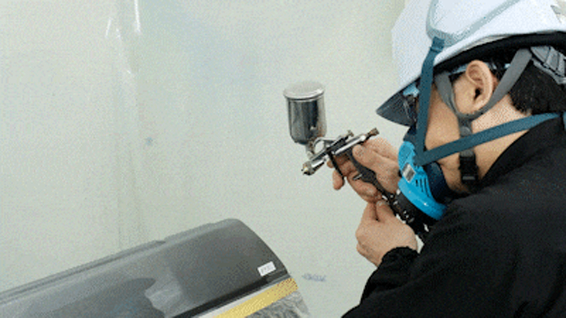 应该选用什么颜色的油漆,应该添加哪种添加剂?在这里,宫地的厚积薄发的丰富经验将发挥点睛之笔的功效。接下来是将准备好的修补漆装配在喷枪上,手动喷涂在打磨完成的部位。