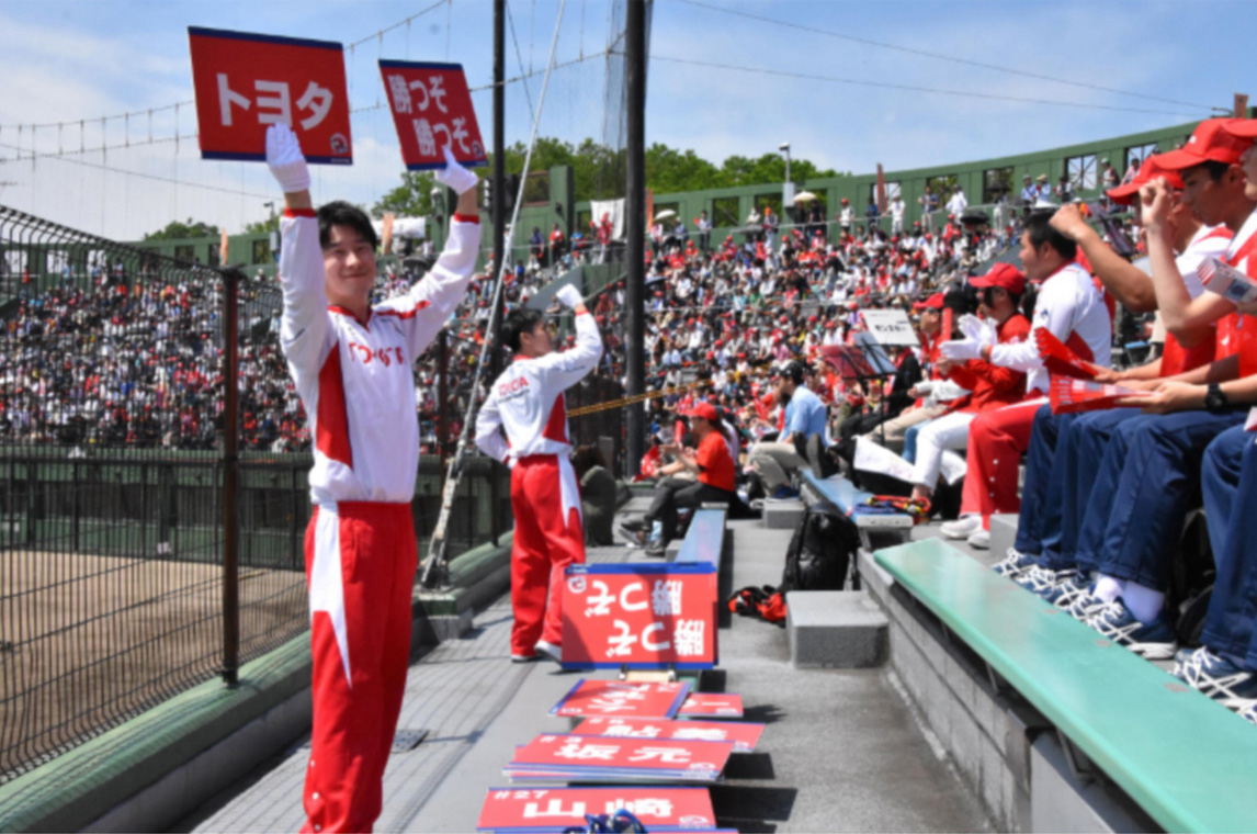 丰田汽车的应援团诞生于1969年。原本这个团队只是为了给棒球部加油的,但后来也会去到日本足球联赛和篮球部的比赛现场为运动员们加油助威。在被称为强化部的7个运动部中,他们现在主要负责硬式棒球部、女子垒球部、橄榄球部、女子篮球部这4个类型。