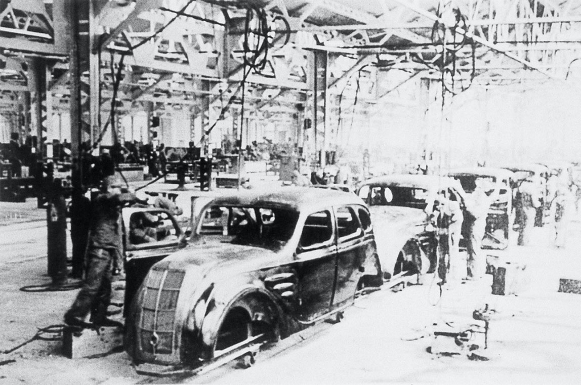 现在的汽车生产工厂。自动化技术不断发展,有自动机械、机器人等