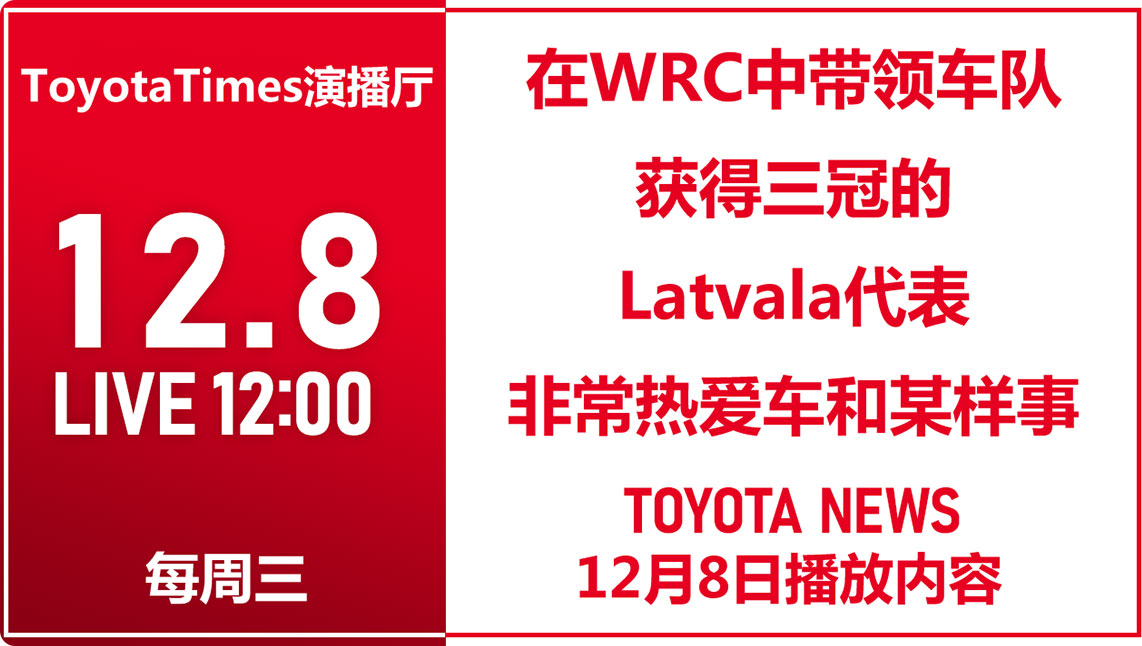 来自TOYOTA GAZOO Racing World Rally Team的Jari-Matti Latvala代表来到了12月1日的ToyotaTimes演播厅现场。Latvala代表带领车队在WRC(FIA世界拉力锦标赛)中摘得三冠。节目中,他叙说了车队对下个赛季的抱负,也透露了自己和丰田章男社长之间的一段趣事。