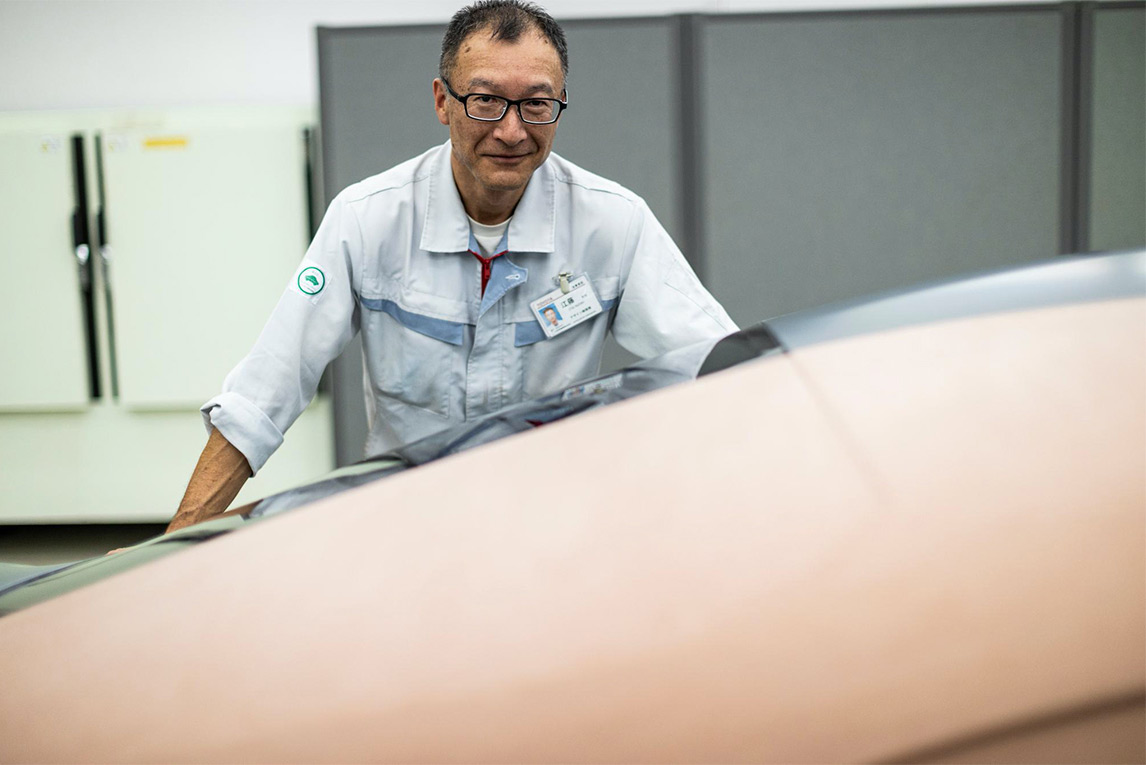 只见他用指尖对准黏土施力对模型进行微调,然后稍微退后,保持一定距离,来确认模型整体的形状,接着再次上前调整黏土造型,这样的动作要反复多次。他的一举一动都充满了气势,让人为之折服。进行油泥模型塑造的地点位于爱知县丰田市,丰田汽车公司内部的设计工作室。