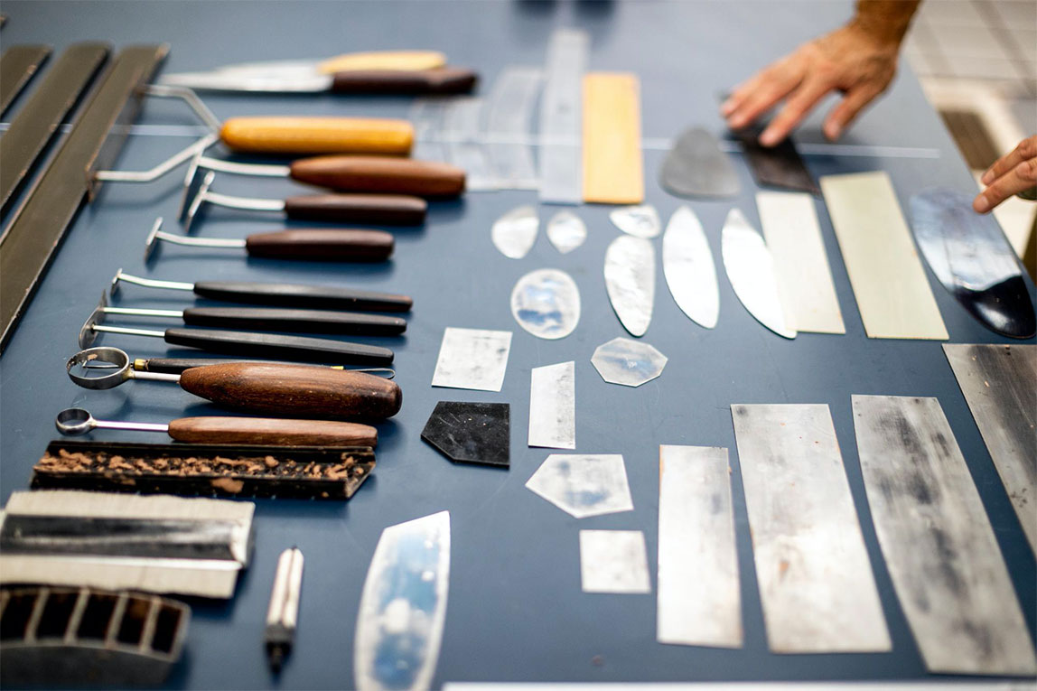 油泥模型师使用自己手工制作的各种塑型工具、各种形状的金属刮刀,手工制作油泥模型。